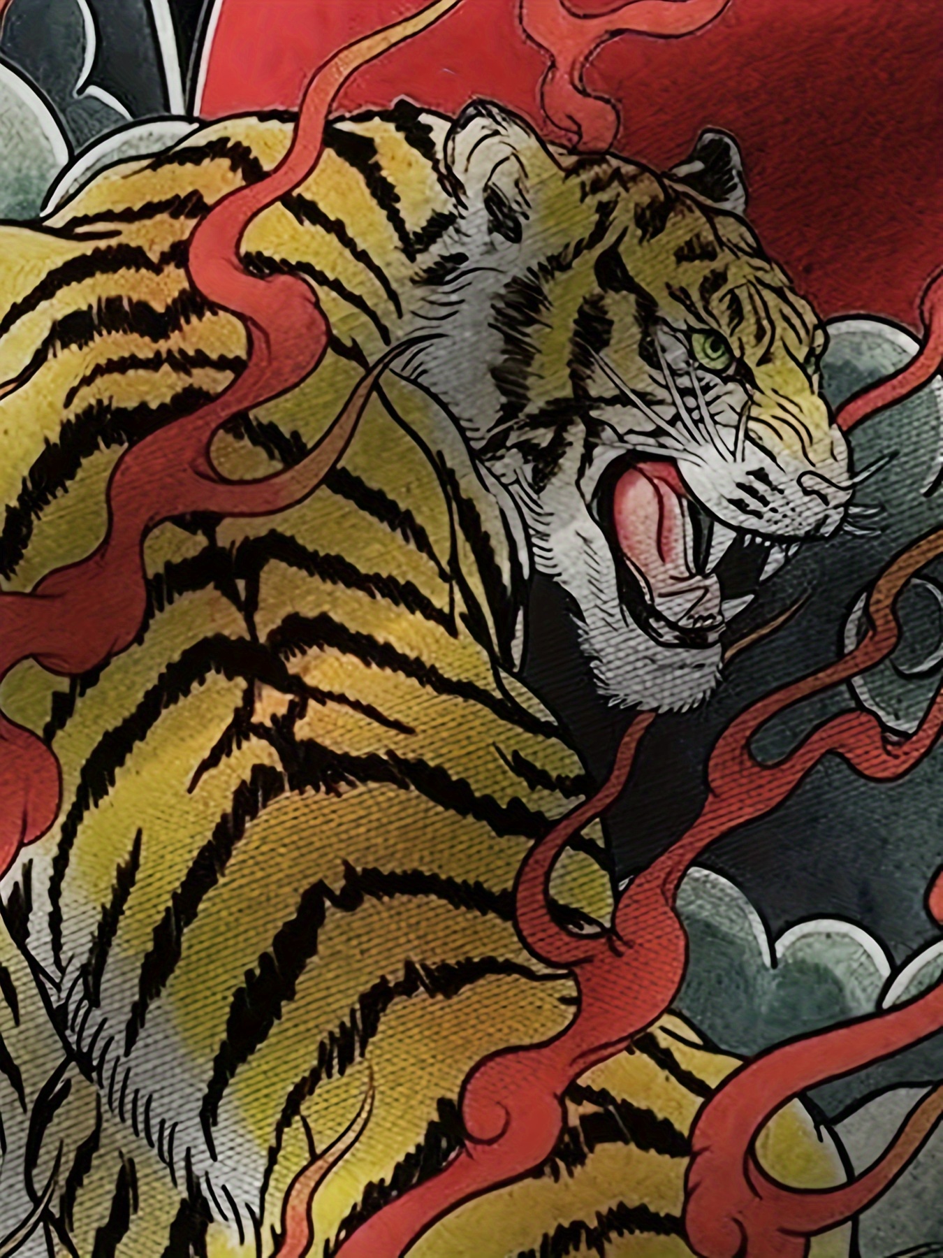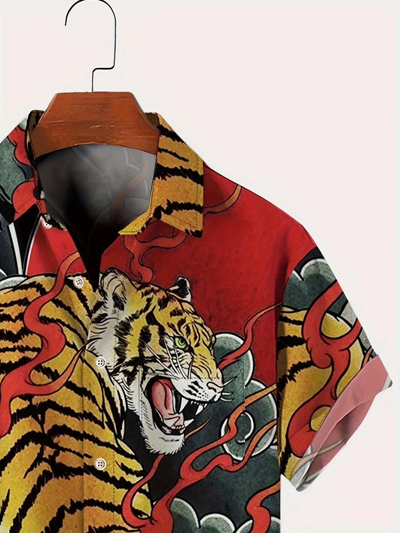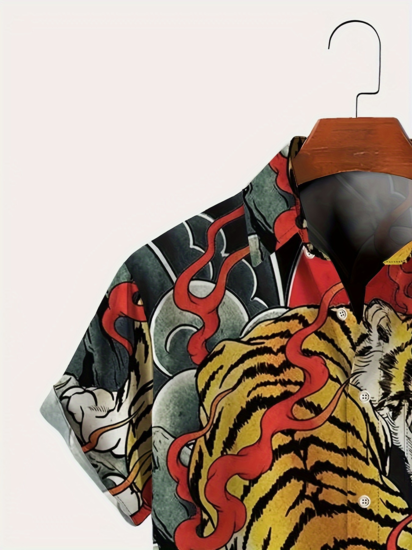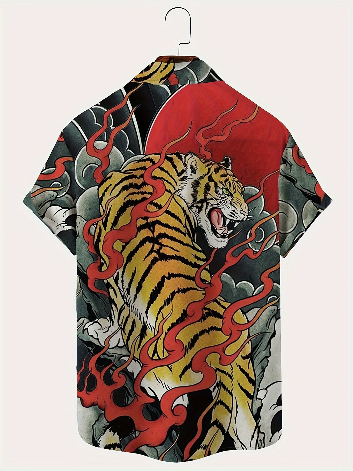 Men's Japanese Ukiyo-e Tiger Shirt - Bold Red & Black Flame Button-Up, Lightweight Non-See-Through Fabric, Regular Fit Casual Shirt for Everyday & Formal Events, Plus Size Available, Summer Outfit, Digital Heat Transfer