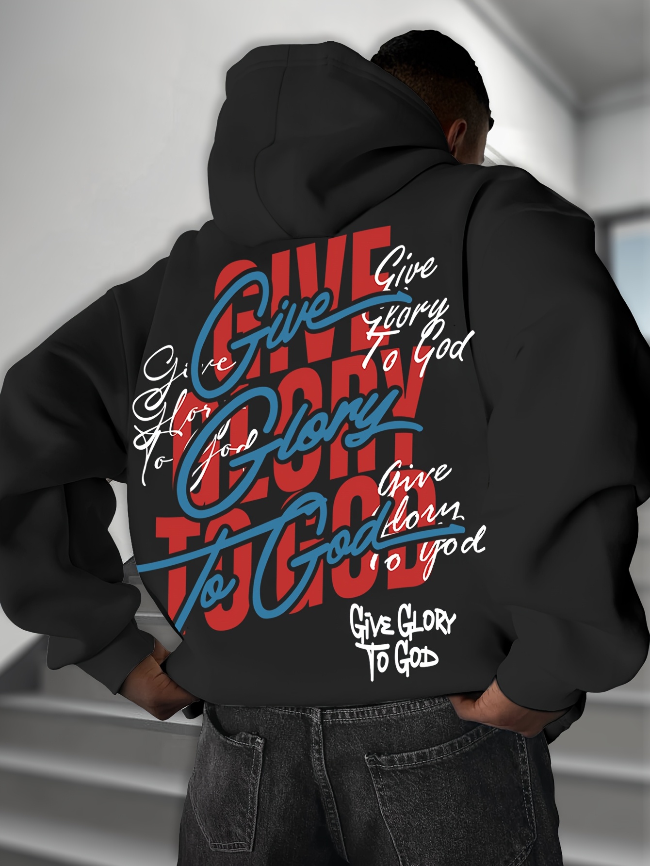 [Cozy Graphic Hoodie] Cozy Polyester Men's "Give Glory to God" Graphic Hoodie - Long Sleeve with Drawstring, Casual Streetwear Pullover for Fall/Winter, Warm Sweatshirt