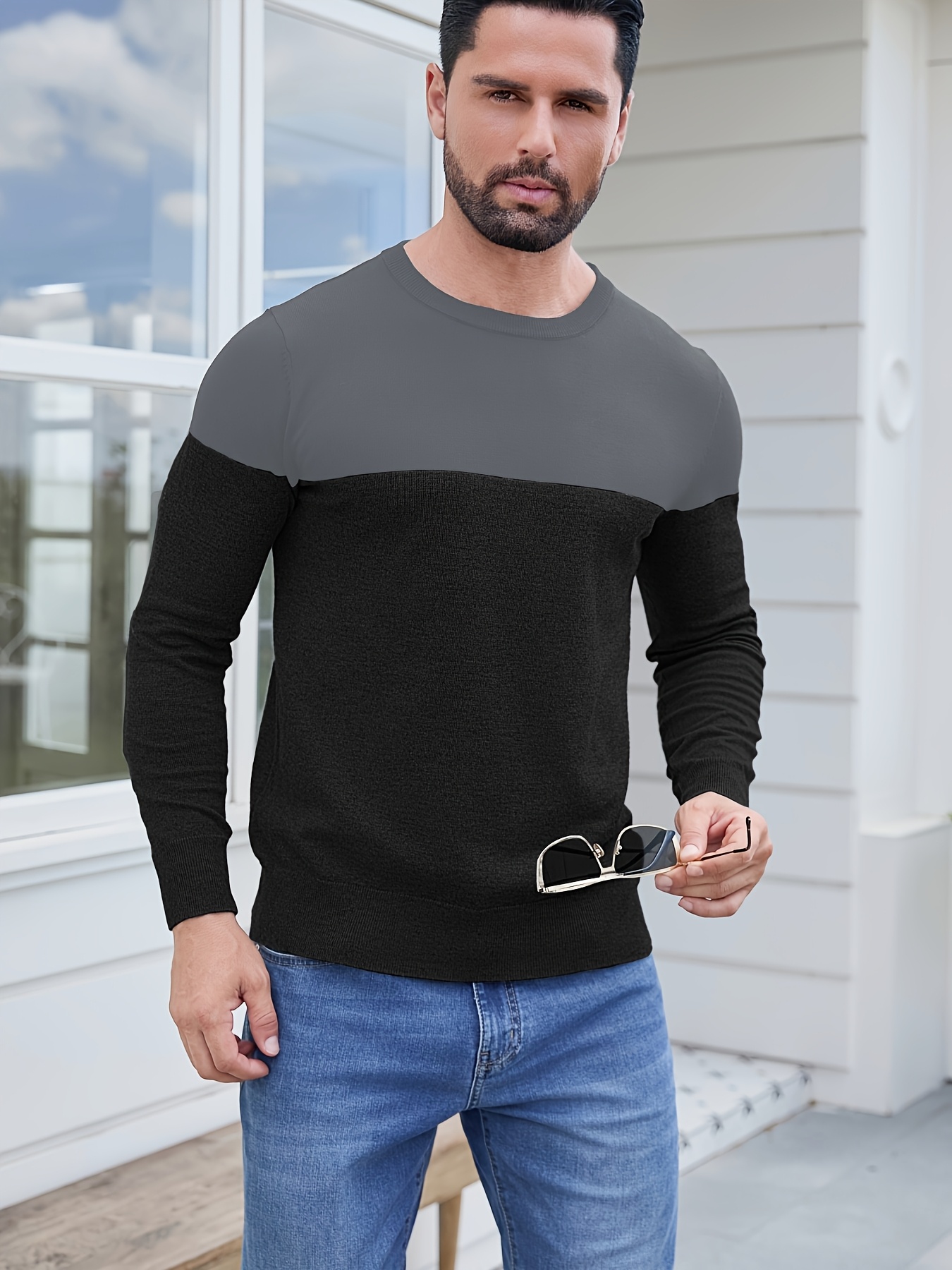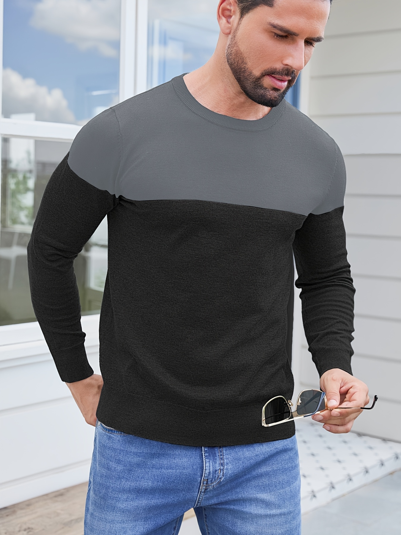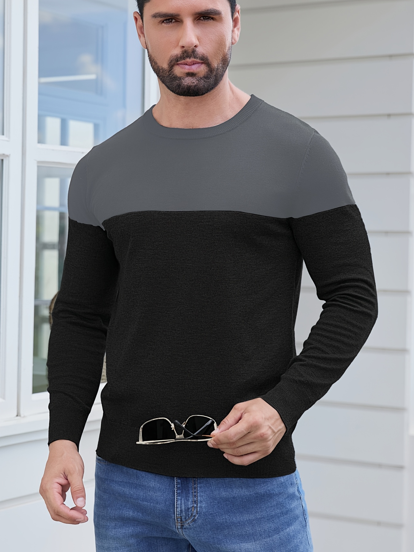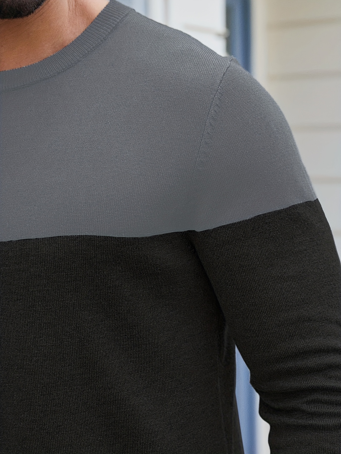 Men'S Casual Long Sleeve Crew Neck Sweater - & Grey Color Block Design, Soft Stretchy Fabric, Regular Fit, Spring/Fall Essential for Casual Attire, Knit, Spring Fall Clothing, Classic Knitwear, Comfortable Knitwear