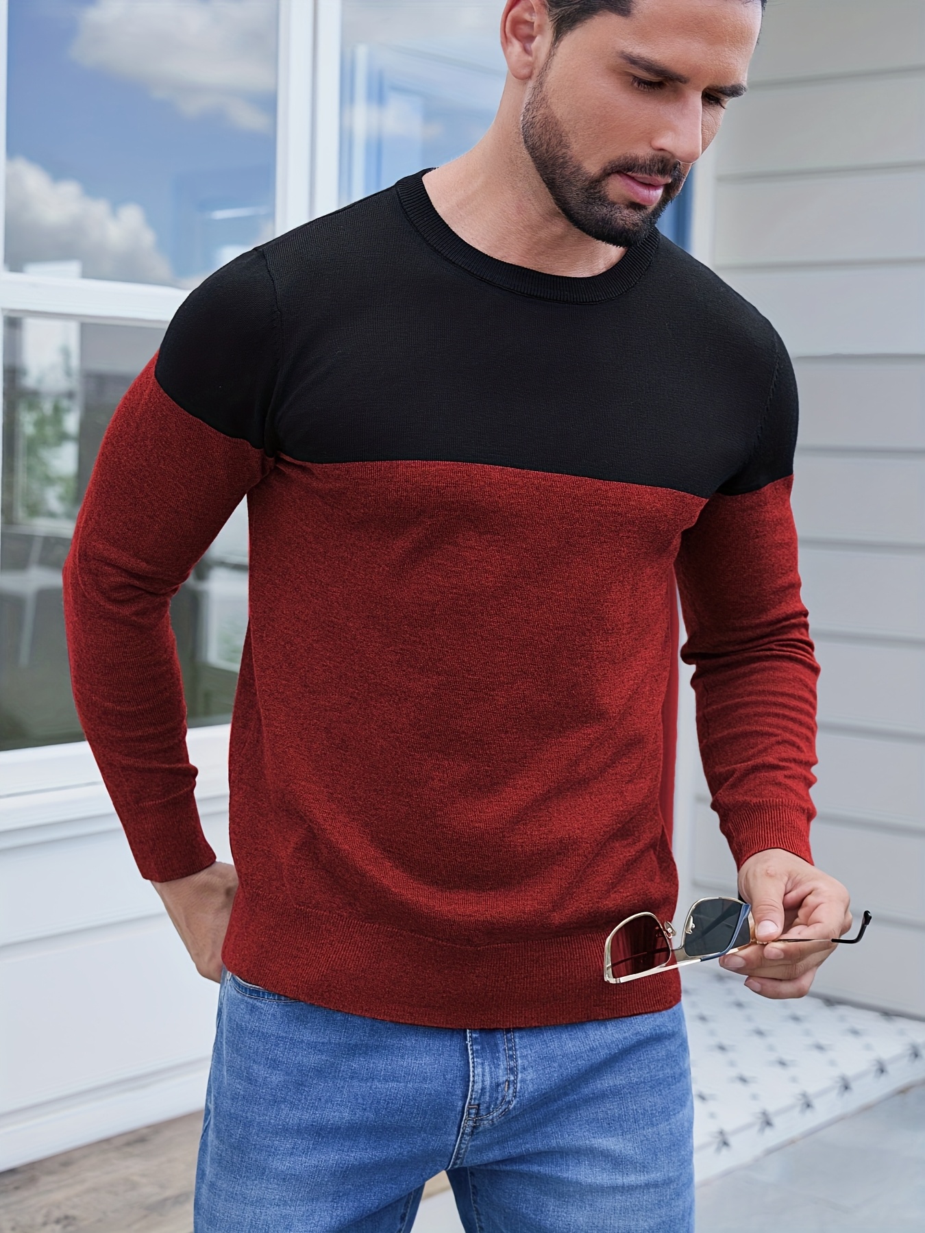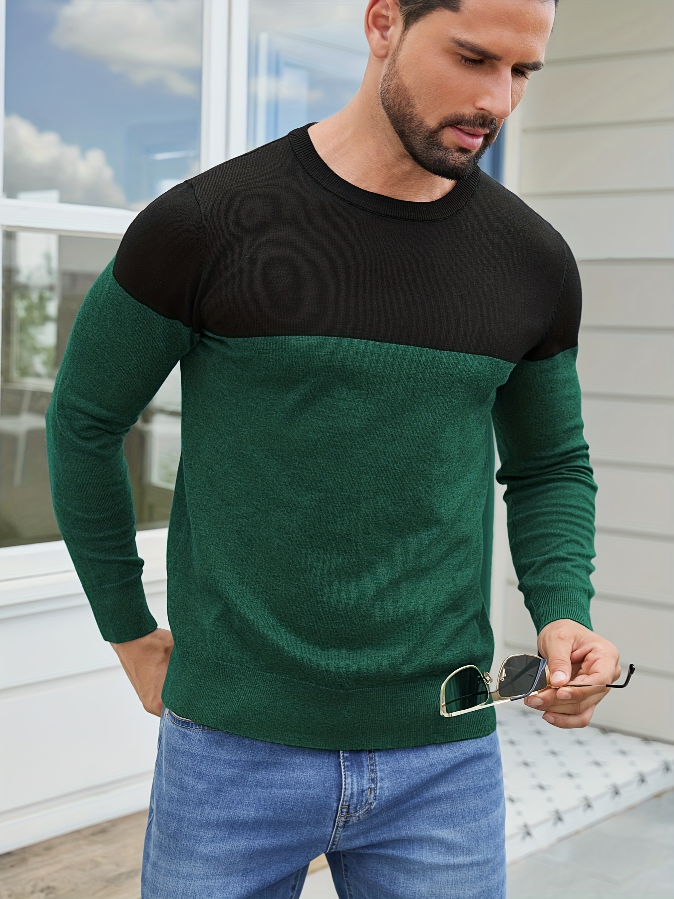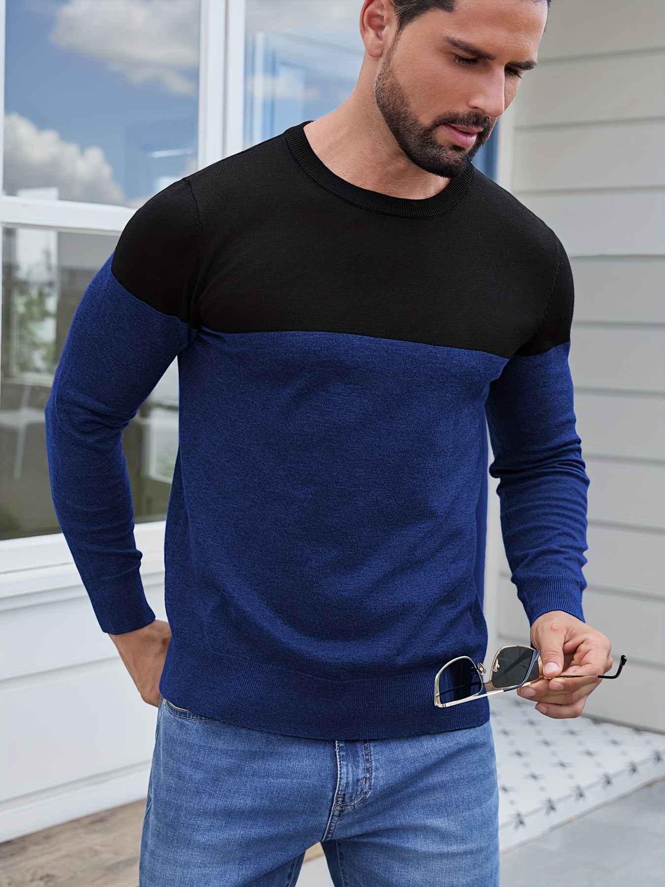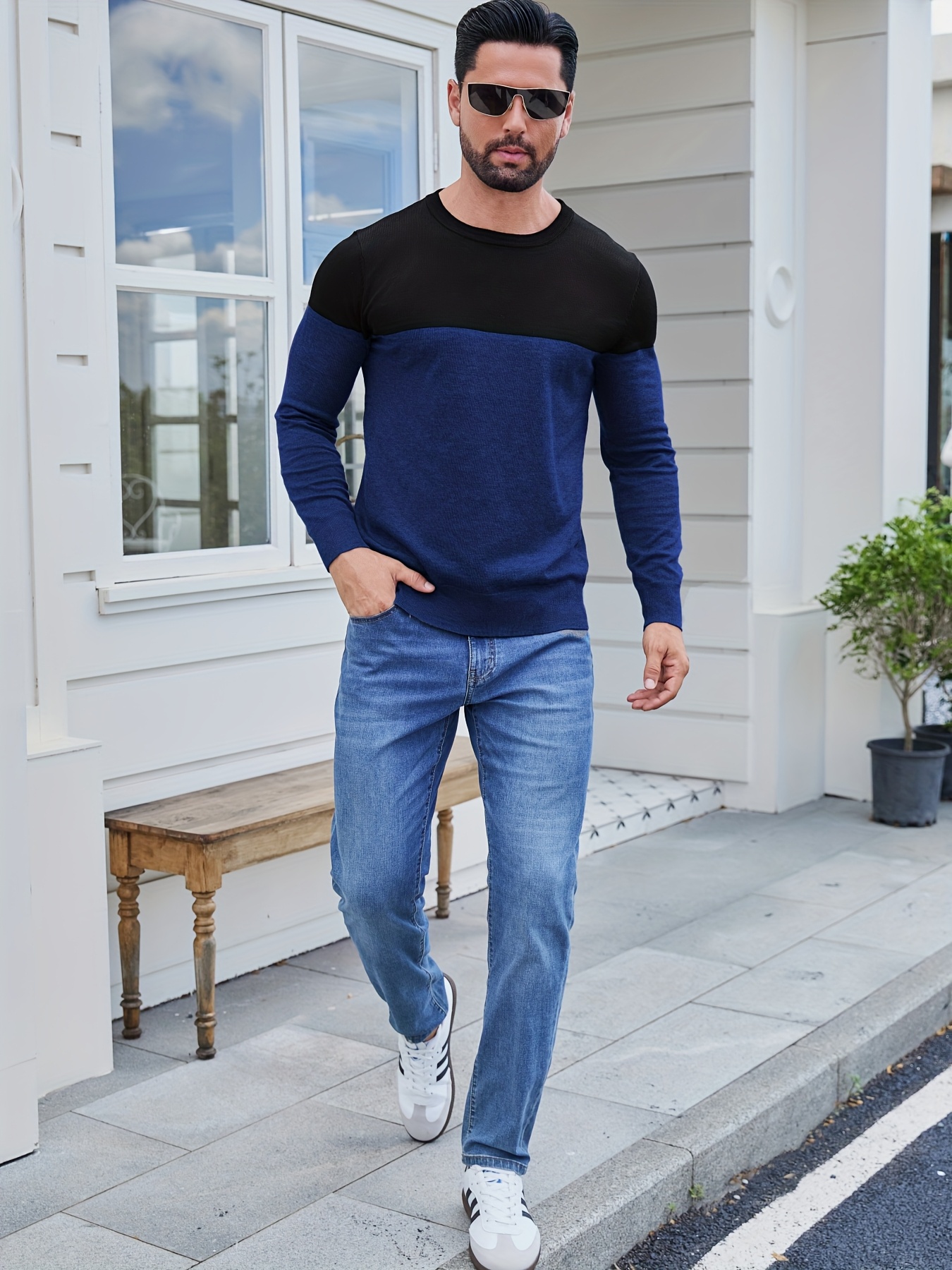 Men'S Casual Long Sleeve Crew Neck Sweater - & Grey Color Block Design, Soft Stretchy Fabric, Regular Fit, Spring/Fall Essential for Casual Attire, Knit, Spring Fall Clothing, Classic Knitwear, Comfortable Knitwear