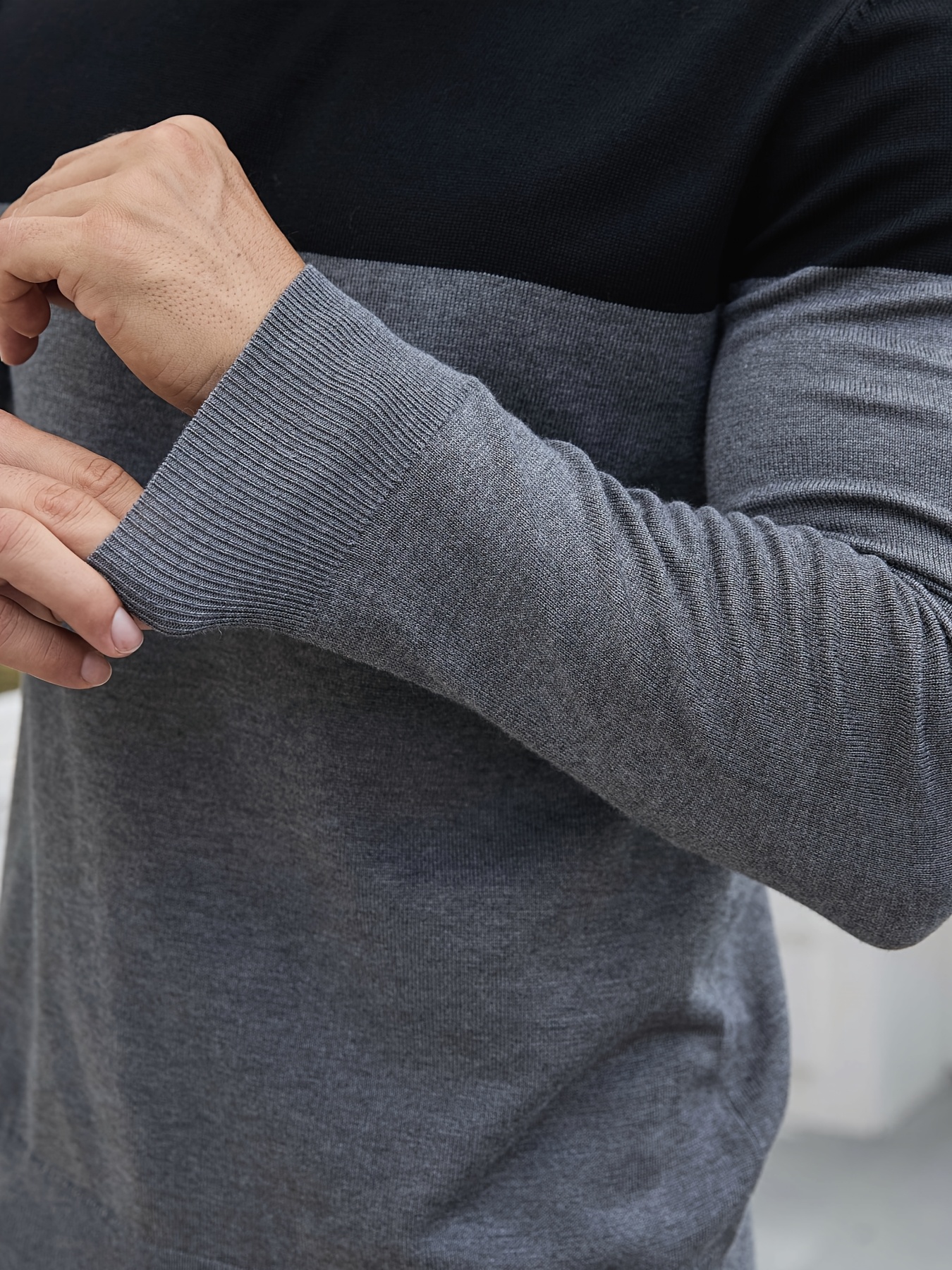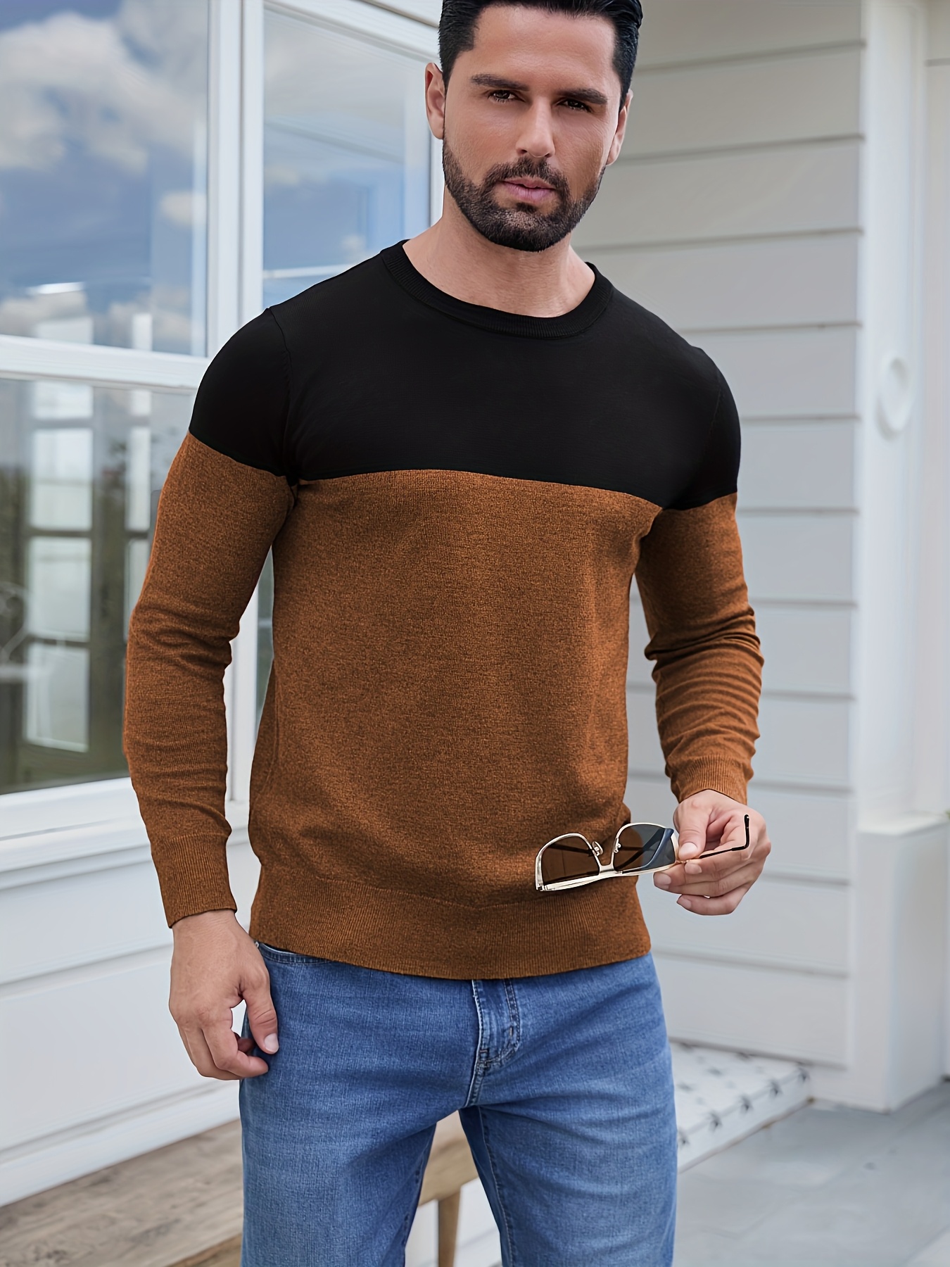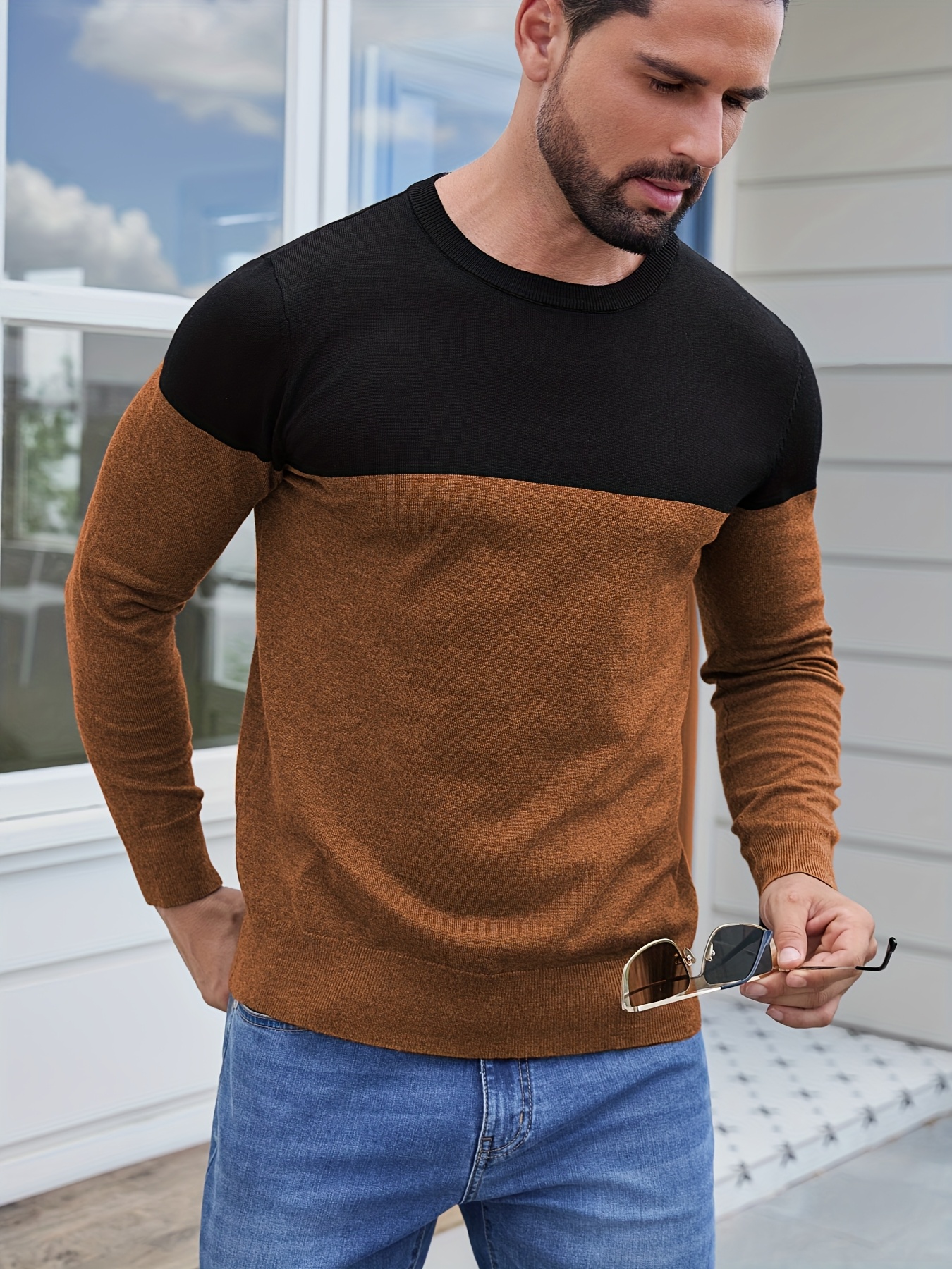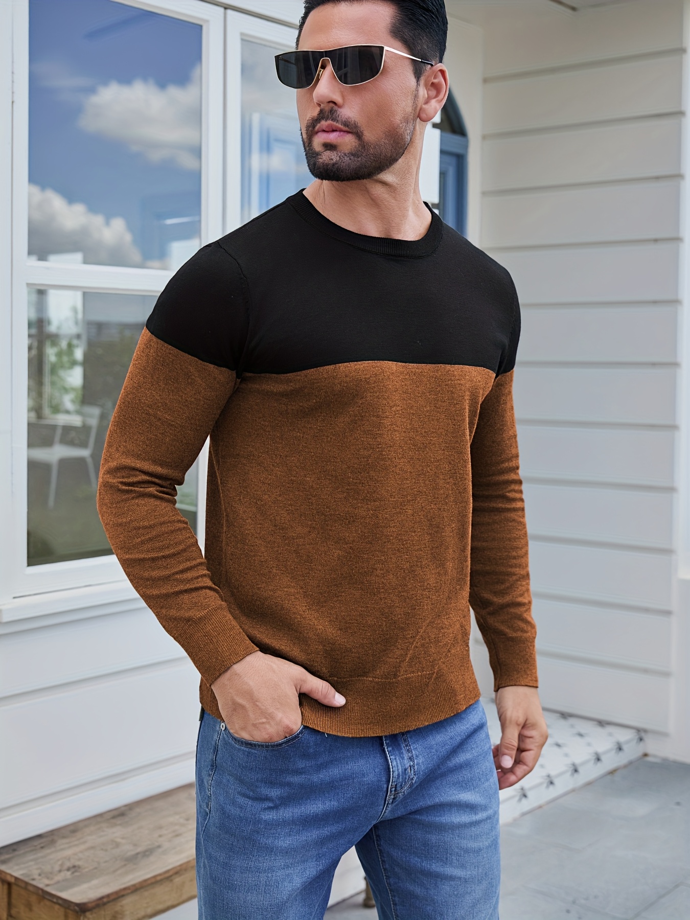 Men'S Casual Long Sleeve Crew Neck Sweater - & Grey Color Block Design, Soft Stretchy Fabric, Regular Fit, Spring/Fall Essential for Casual Attire, Knit, Spring Fall Clothing, Classic Knitwear, Comfortable Knitwear