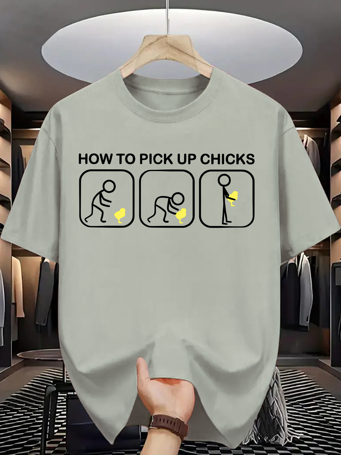 Men's Summer Fashion Graphic Tee - "HOW to PICK UP CHICKS" Print, Casual Crew Neck Short Sleeve T-Shirt, Polyester, Machine Washable, Blue with White Illustrations, Summer T Shirts